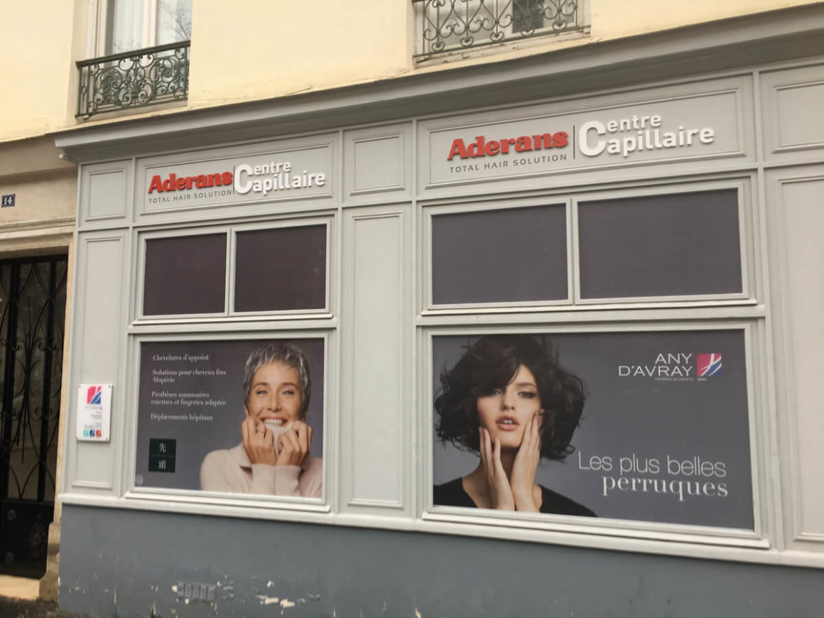 Enseignes et marquage vitrines Any d’Avray Lettrages relief PVC. Vinyl micro-perforé. Panneau plexiglass horaires sur entretoises.