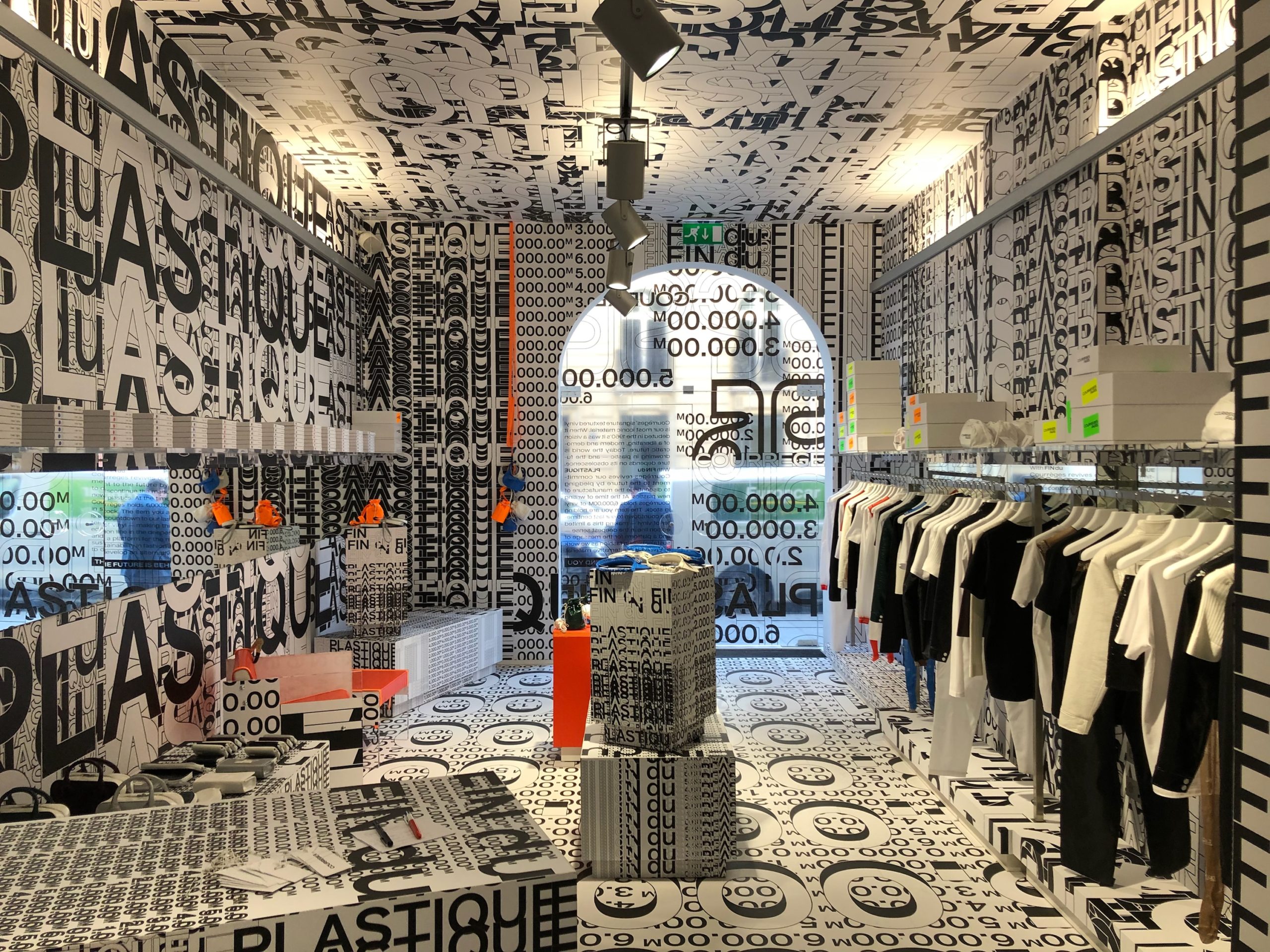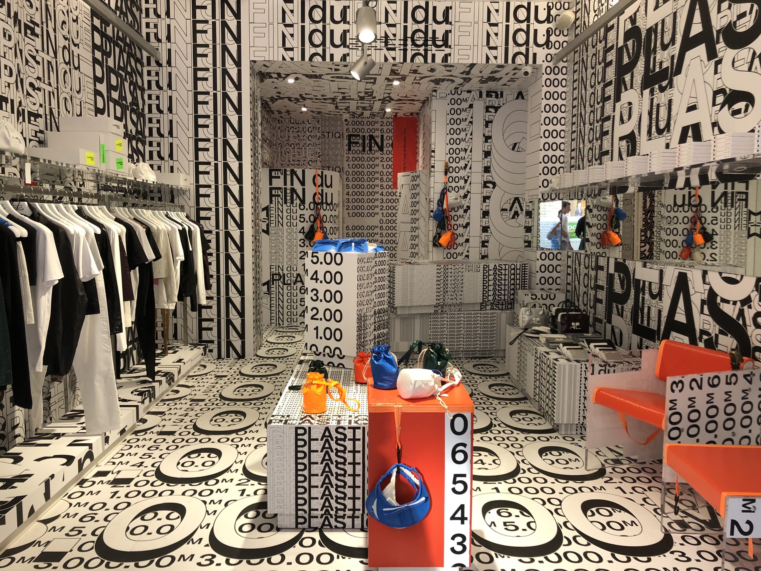 Suite à la création visuelle de l’artiste parisien Christophe Hamaide Pierson pour la célèbre marque Courrèges, nous avons effectué un total covering de la boutique comprenant, les murs, les plafonds le sol, & l’agencement (meubles comptoir)
